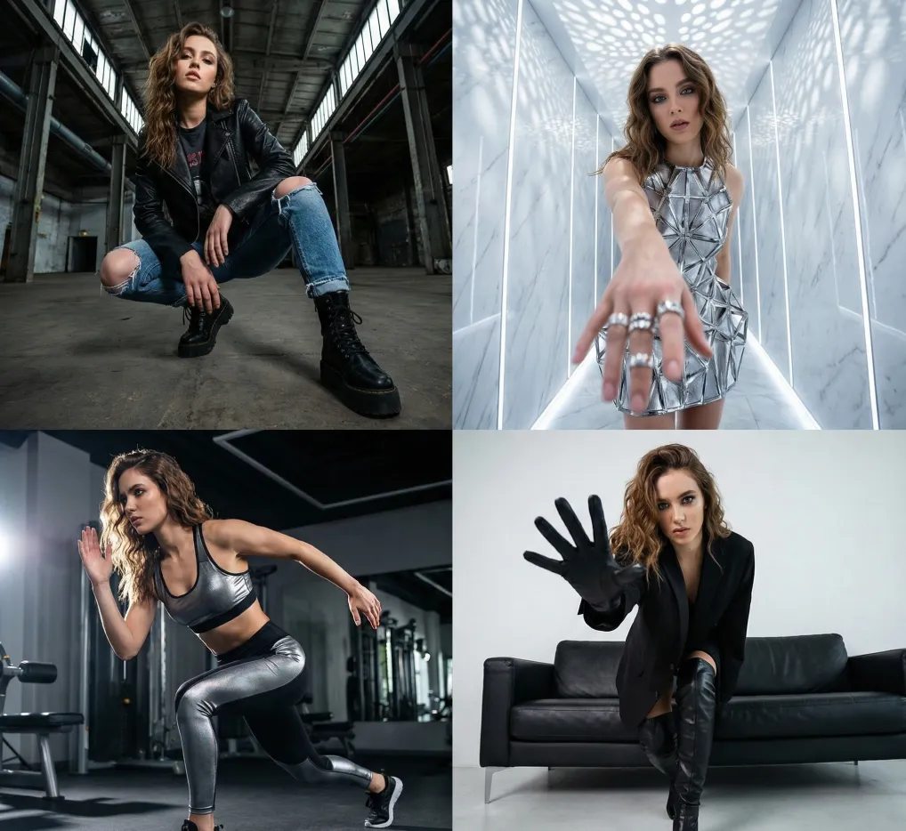 A four-quadrant photo composite featuring different stylized portraits of a young woman with wavy brown hair. Top Left: Low-angle shot of her squatting in a grungy industrial studio, wearing a black leather jacket, ripped jeans, and chunky combat boots, looking confidently at the camera. Top Right: High-angle perspective in a futuristic marble corridor. She wears an abstract silver geometric structural dress, extending a hand with multiple chunky silver rings toward the lens, bathed in soft dappling light. Bottom Left: Low-angle shot in a modern gym, captured mid-lunge in a dynamic pose. She wears a metallic silver and black sports bra with matching high-performance leggings, strong directional lighting emphasizing movement and athletic form. Bottom Right: Low-angle wide shot in a minimalist room with a sleek black leather couch. She wears an oversized black tailored blazer with no shirt underneath, paired with thigh-high boots and fitted black leather gloves. She leans slightly forward, extending a gloved hand with splayed fingers toward the viewer, gaze sharp and commanding. The overall style is edgy, high-fashion photography with dramatic lighting, strong perspective distortion, and a cohesive editorial aesthetic.
