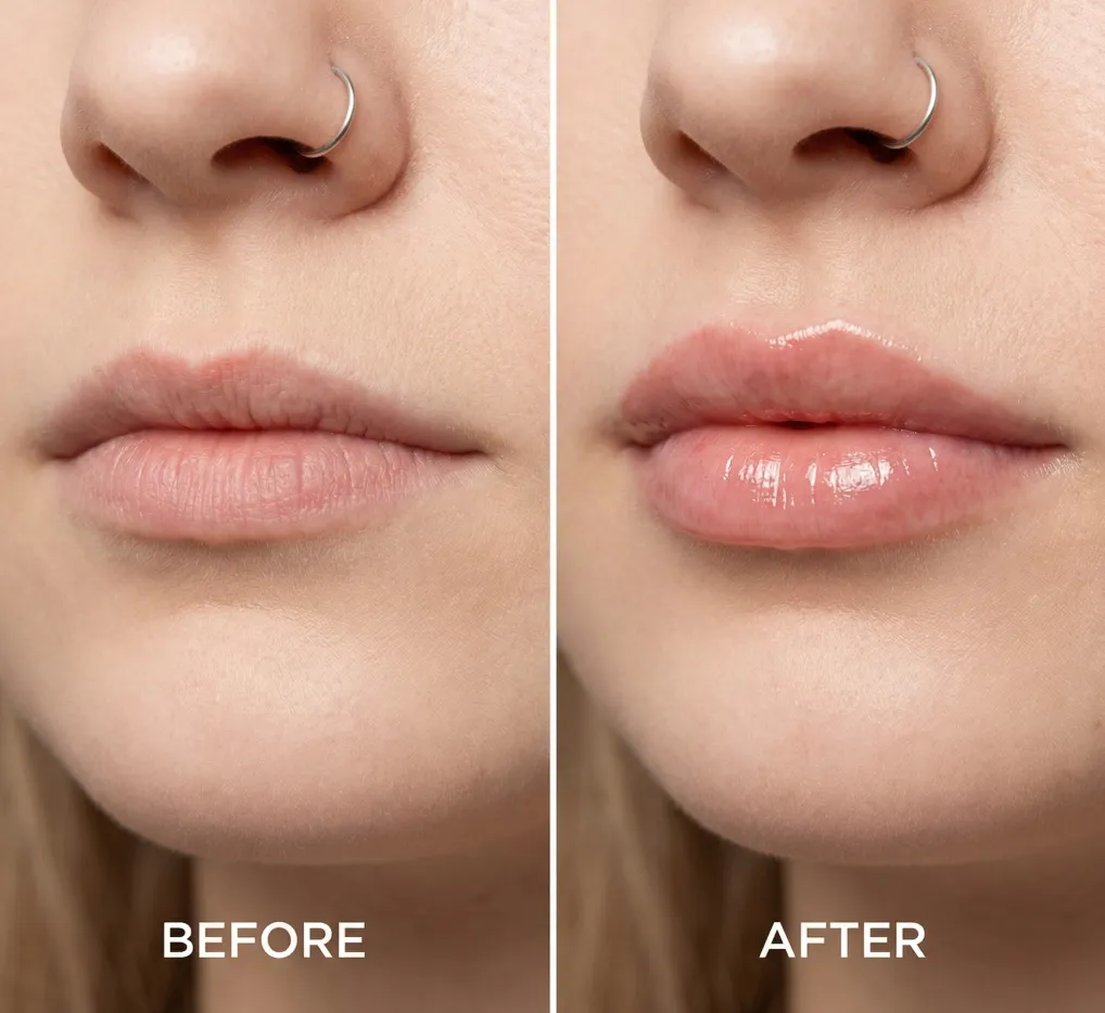 side-by-side before and after photo of the exact same young woman, **BEFORE** (left) thin natural lips vs **AFTER** (right) noticeably plumper lip filler, clear visible difference in lip volume but still natural-looking same woman both sides, early-mid 20s, European features, very fair neutral skin, silver nose ring, lips slightly parted showing a bit of upper teeth, relaxed neutral expression tight macro crop on nose lips chin only, slightly low angle at mouth level, 90mm macro lens style, ultra sharp focus on lips skin pores fine lines texture, very shallow DoF, soft blurred neutral background identical soft clinical front lighting with slight top fill both images, low-medium contrast, neutral daylight WB, realistic tones, no heavy color edits **BEFORE** left: very thin flat natural lips, matte dry-ish texture, weak soft cupid’s bow, blurry undefined lip border, visible vertical lip lines uneven surface, natural pores light redness on skin **AFTER** right: clearly increased volume plump fuller lips, hydrated glossy soft sheen, sharply defined prominent cupid’s bow and crisp vermilion border, smoother but realistic lip texture keeping fine lines, pores and skin texture unchanged dramatic yet realistic lip volume enhancement comparison, extreme photorealism, 8K ultra high res, razor crisp micro details on lips and skin, only natural grain, NO text NO arrows NO lines NO watermarks NO over-smoothing NO exaggerated fake look NO beauty filters NO face change