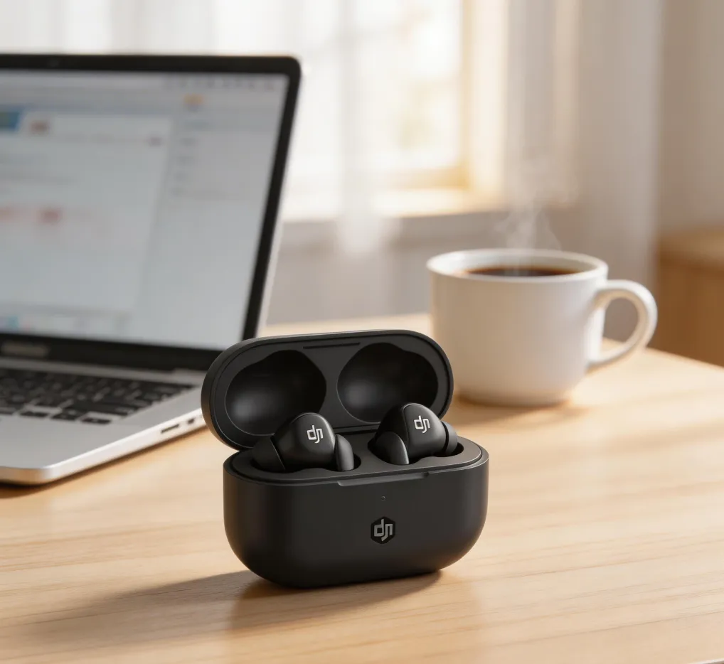 Premium matte black wireless earbuds, exact original shape and logo preserved, placed on Nordic wooden desk next to open MacBook and coffee cup, soft morning window light, professional product photography, shallow depth of field emphasizing subject