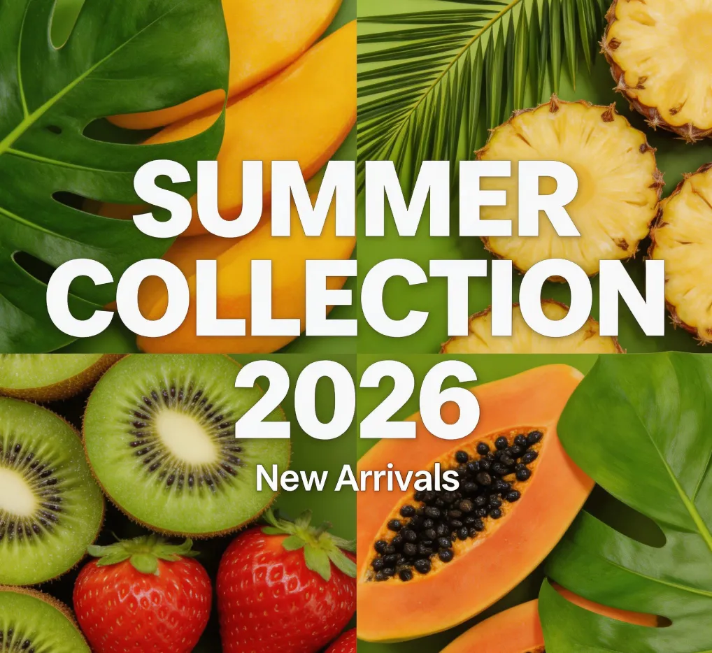 2×2 grid poster layout, large centered title "SUMMER COLLECTION 2026", smaller subtitle "New Arrivals", vibrant tropical fruit background, fresh color palette, clean margins for typography, modern minimalist style